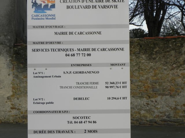 Les travaux de construction du Skate Park de Carcassonne ont débuté, on connais ainsi exactement le prix du très discuté Skate Park à CarcassonneSelo ce qu'on peut voir sur l'affichage du chantier le prix avoisine les 152 mil euros.
